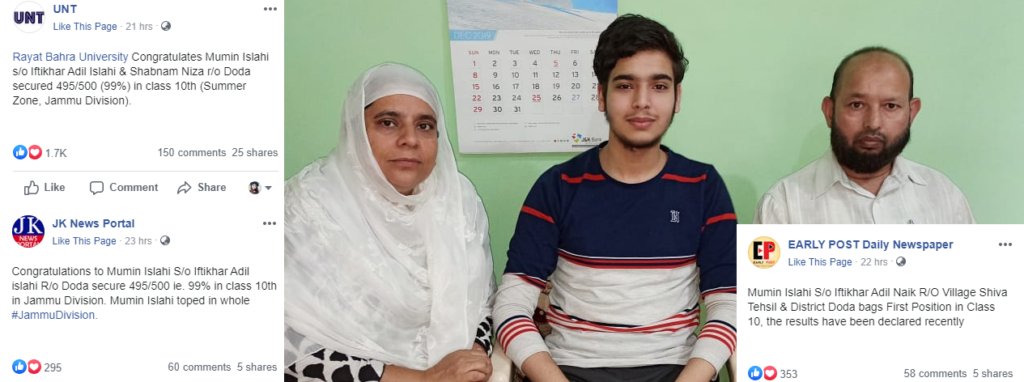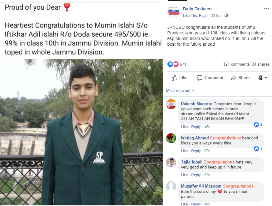 Congratulates Mumin Islahi s/o Iftikhar Adil Islahi & Shabnam Niza r/o Doda secured 495/500 (99%) in class 10th (Summer Zone, Jammu Division)