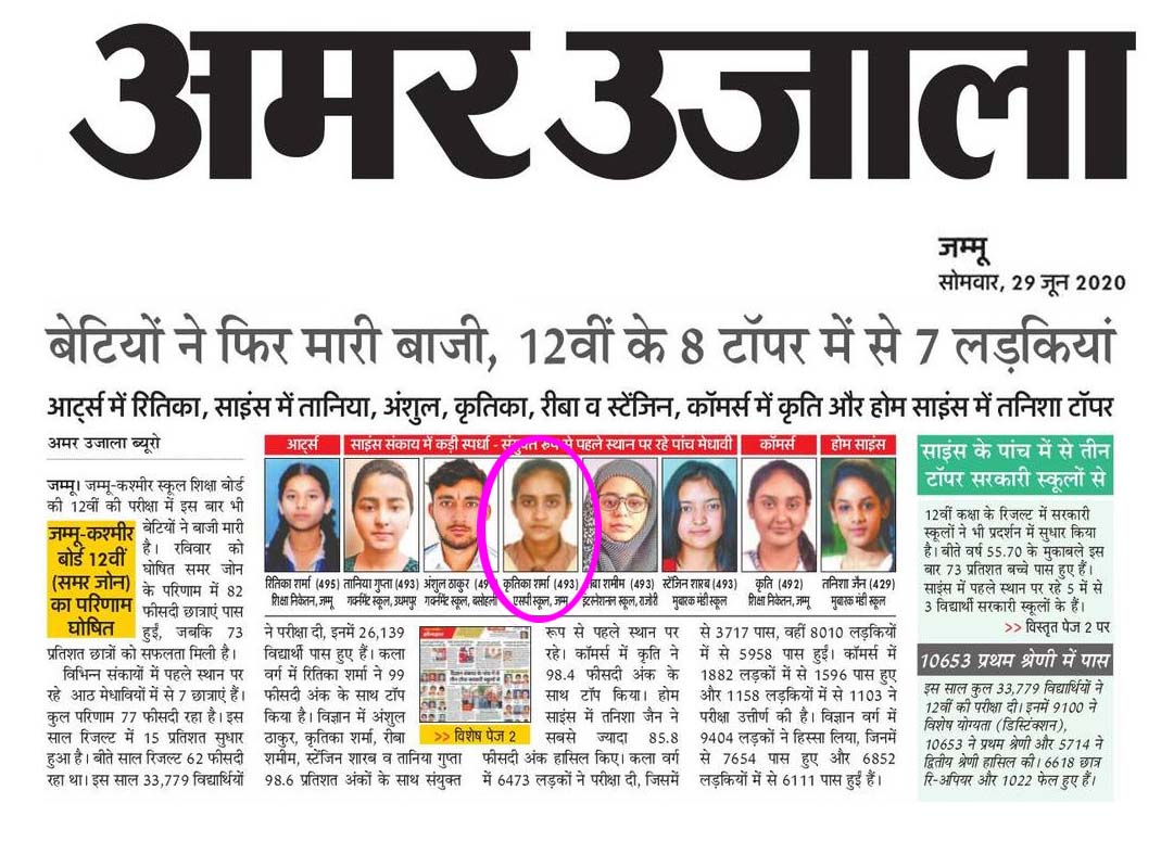 Jammu daughter 1st Position in Class 12th