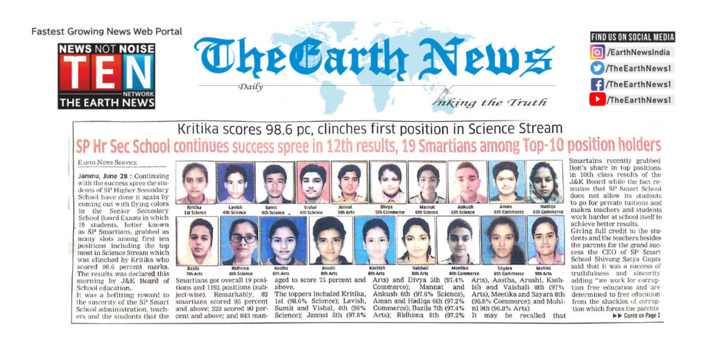 JKBOSE declared the result of class 10th students of SP Smart School Shined with Bright Colours