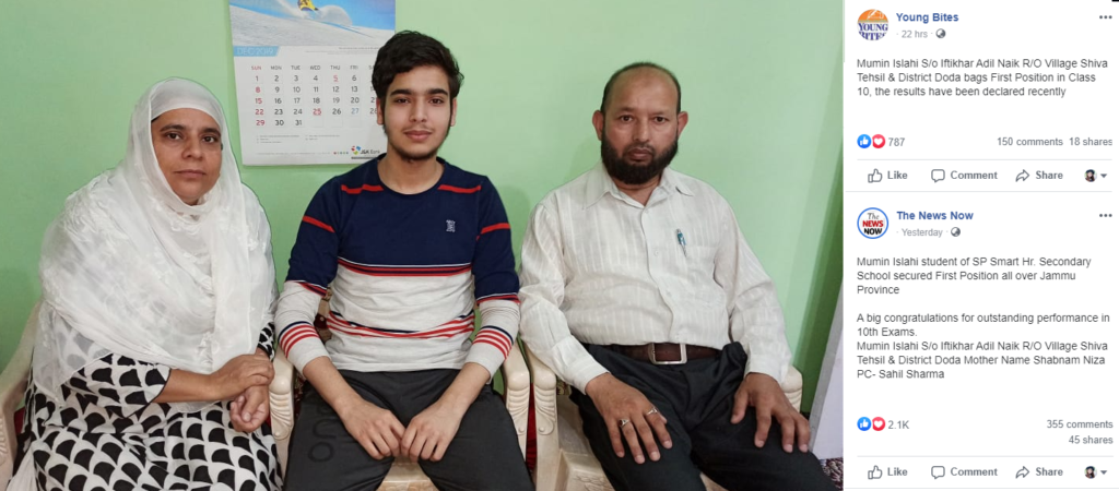 Congratulates Mumin Islahi s/o Iftikhar Adil Islahi & Shabnam Niza r/o Doda secured 495/500 (99%) in class 10th (Summer Zone, Jammu Division)