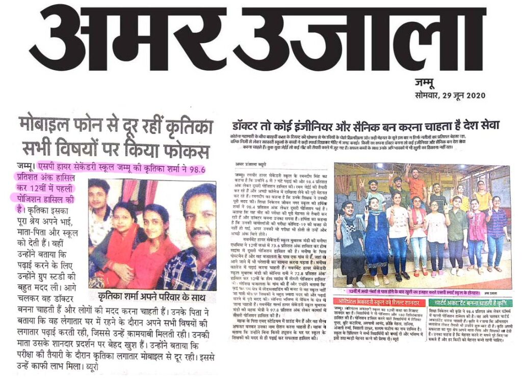 Shubham Thakur, a Student of SP Smart School, Jammu, who achieved 2nd Position in recently announced class 10th Result of Jammu Div (Summer Zone).